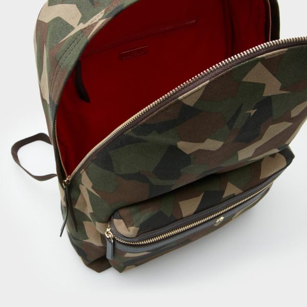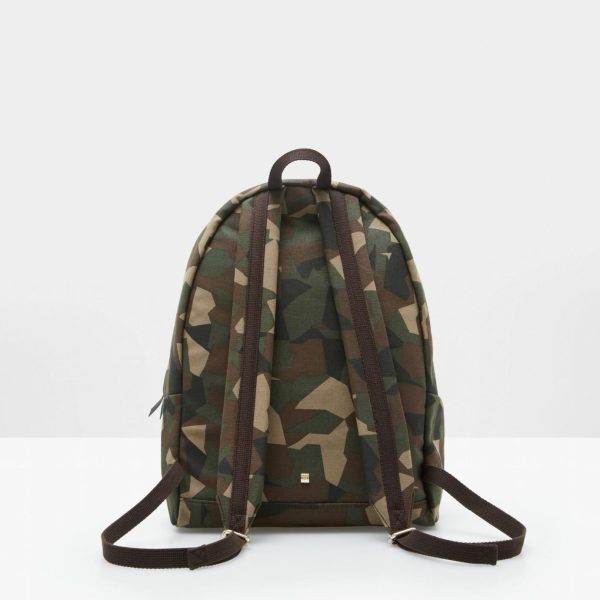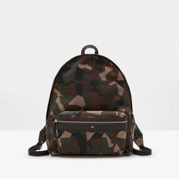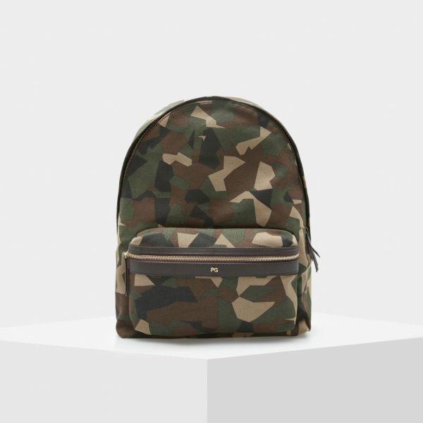Canvas backpack with a geometric camouflage print. Exterior zip pocket and metallic PG logo.