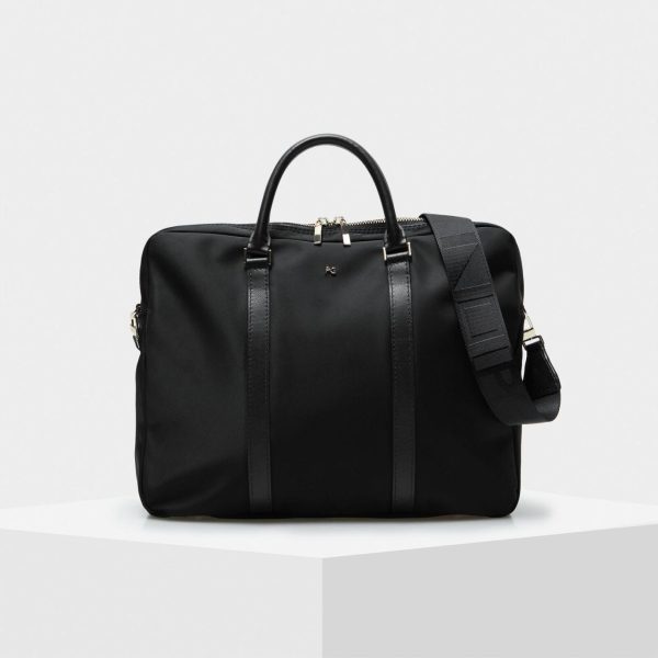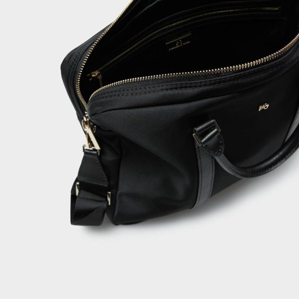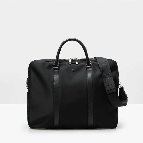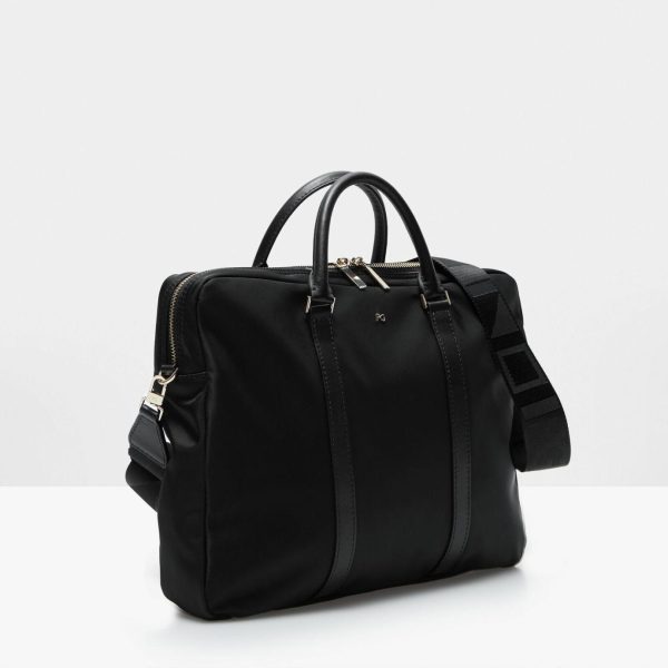 Nylon document bag with matching leather details. Leather handles and detachable and adjustable grosgrain strap. Zip fastening and lined interior with a zip pocket.