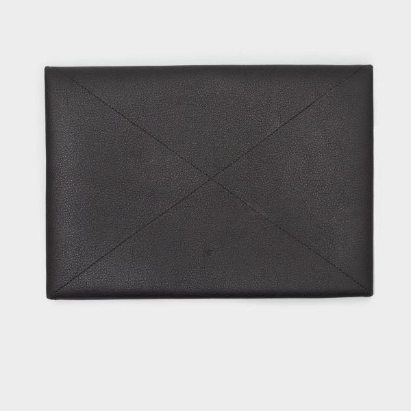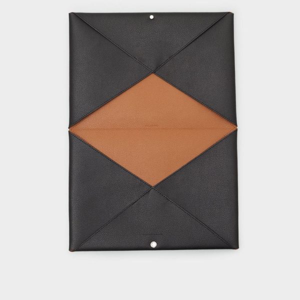 Leather document wallet with two compartments for A4 sheets. Fold-over snap fastening and contrasting interior.