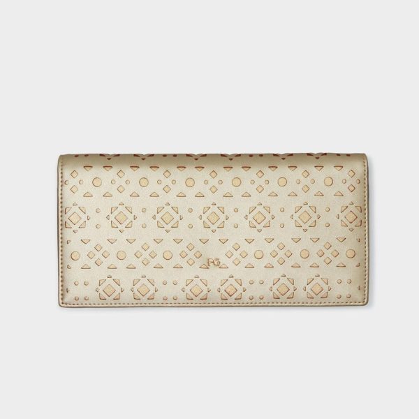 American wallet in cutout leather with metallic PG logo. Interior compartments for bills, cards and coins.