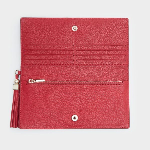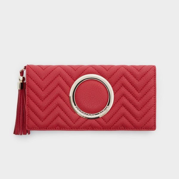American wallet in quilted leather detailed with a metallic ring and a matching tassel. Interior compartments for bills, cards and coins.