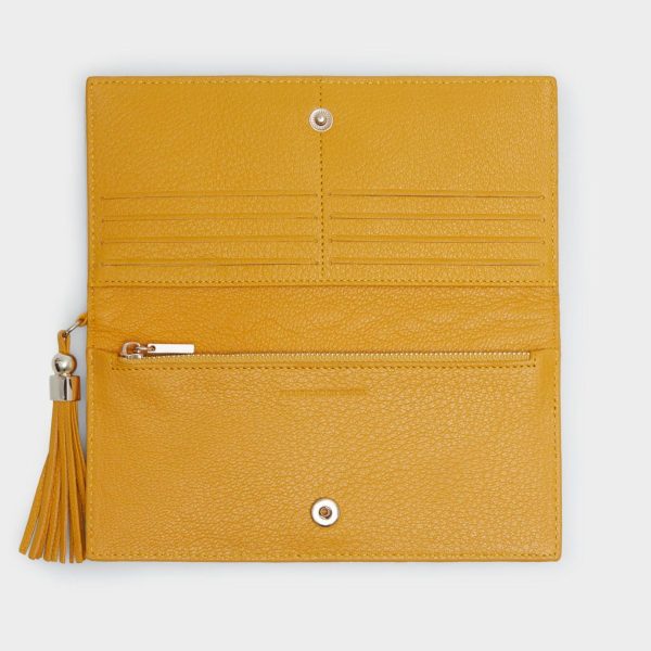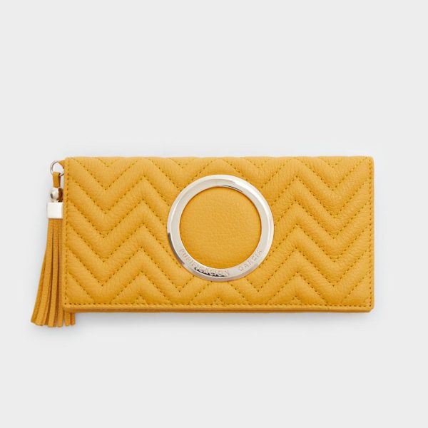 American wallet in quilted leather detailed with a metallic ring and a matching tassel. Interior compartments for bills, cards and coins.
