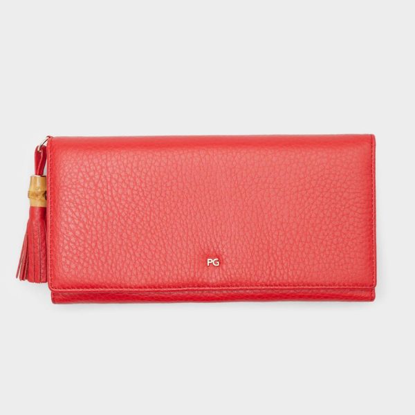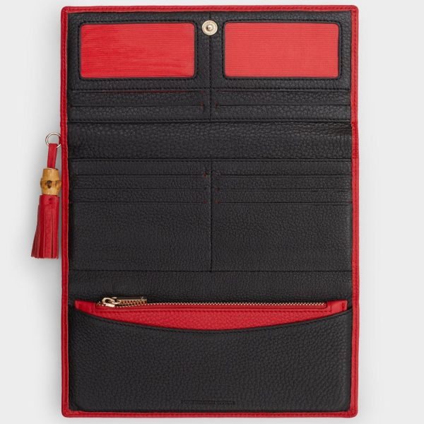 American leather wallet with a snap-fastening flap and a bamboo-detailed tassel. Removable coin purse and interior compartments for cards and bills.