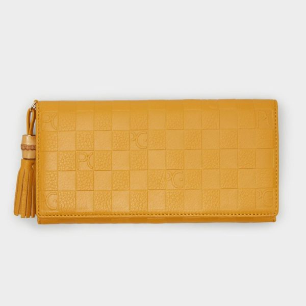 American wallet in leather embossed with our PG cube pattern and detailed with a matching tassel. Snap-fastening flap, interior compartments for cards and bills and removable coin purse.