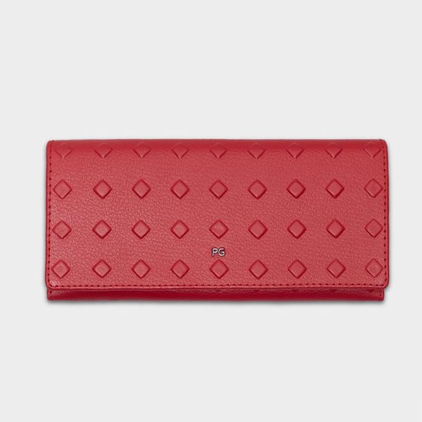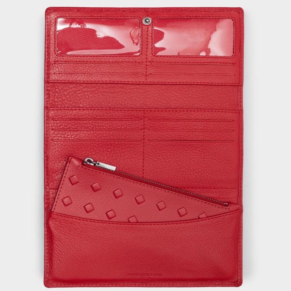 Leather wallet with lined studs and snap-fastening flap. Interior with compartments for cards and bills and removable coin purse.