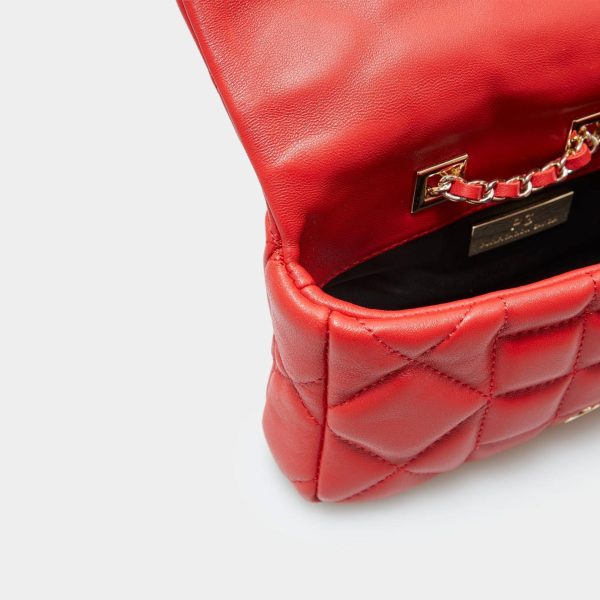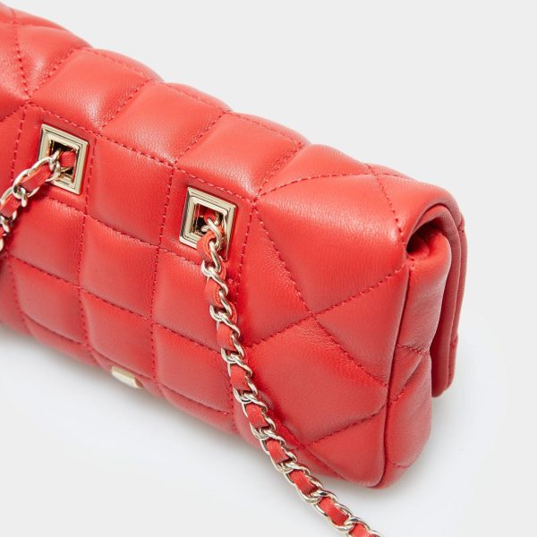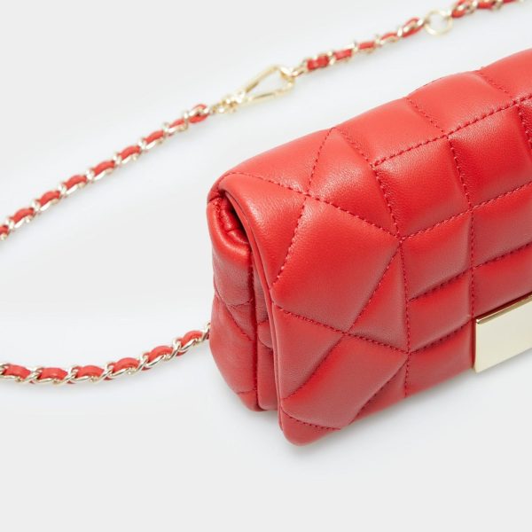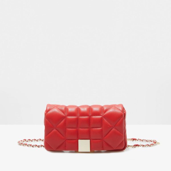 Quilted leather belt bag with a snap fastening flap and a metallic cube-shaped plate. Two-position adjustable chain strap and fully lined interior.