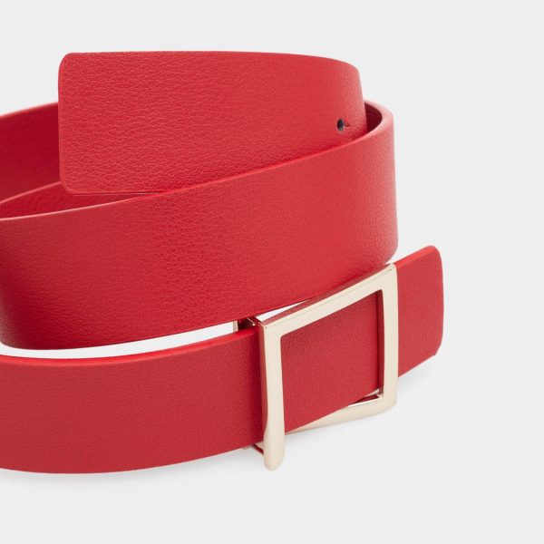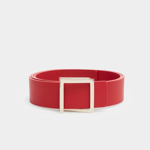 Leather belt with matching edging and a metallic cube-shaped buckle. Width: 3.6 cm