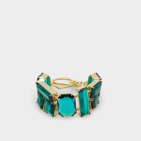 Gold plated bracelet featuring clear crystal beads and a cube-shaped fastening.