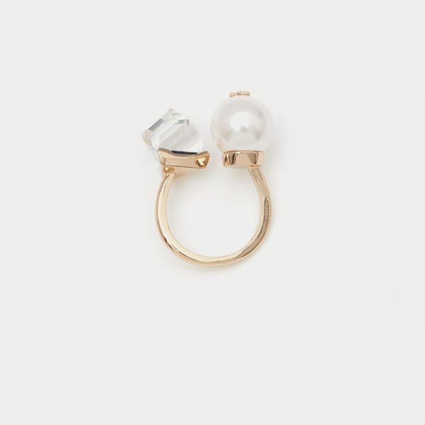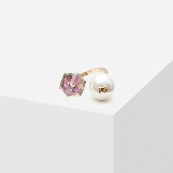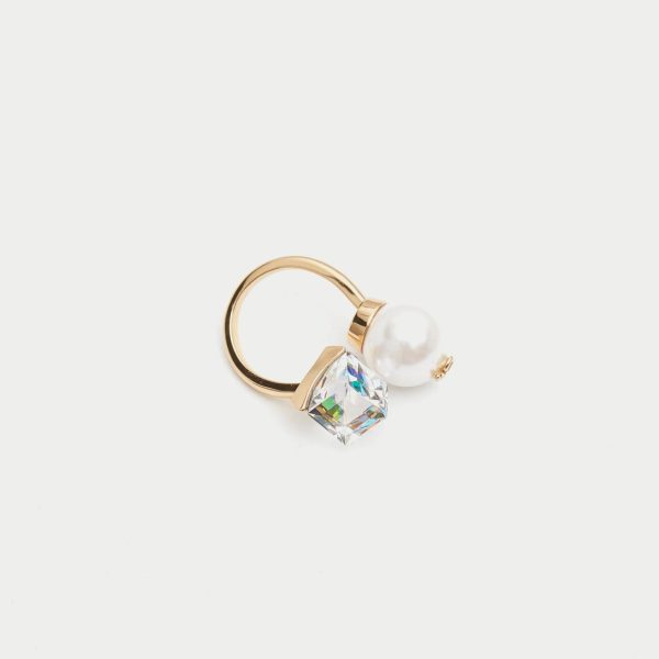 Gold plated ring featuring a logo-detailed faux pearl and a crystal cube.