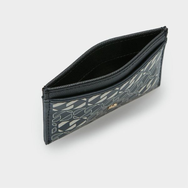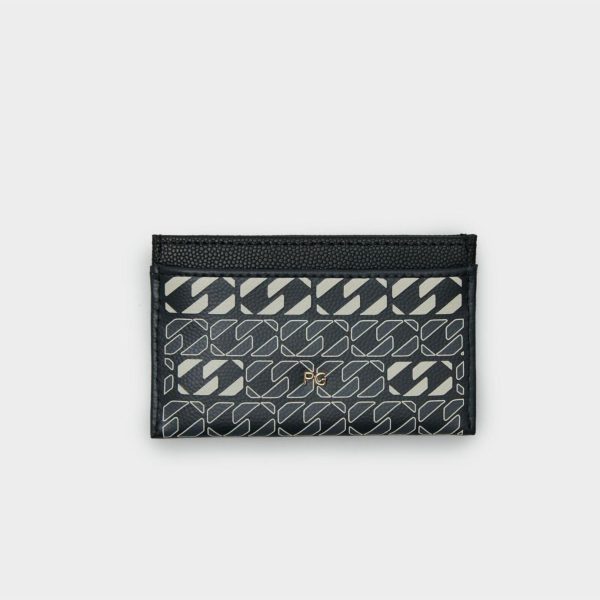 Leather card holder with a geometric-chains print. 2 card slots and 1 single slip pocket.