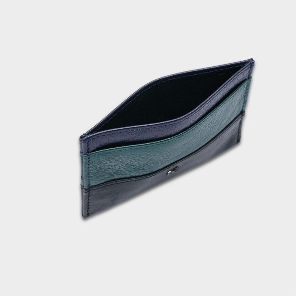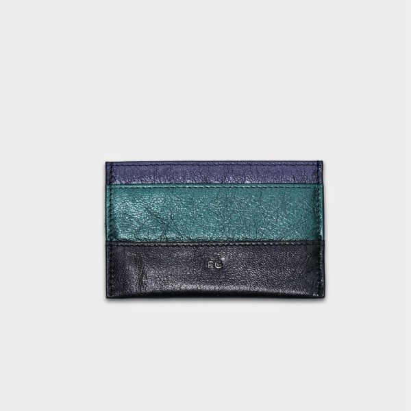 Leather card holder with a patchwork design and metallic finish. Detailed with the PG logo.