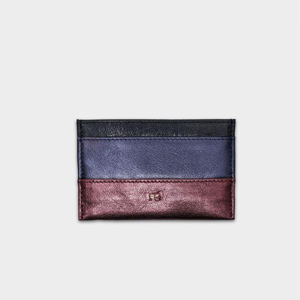 Leather card holder with a patchwork design and metallic finish. Detailed with the PG logo.