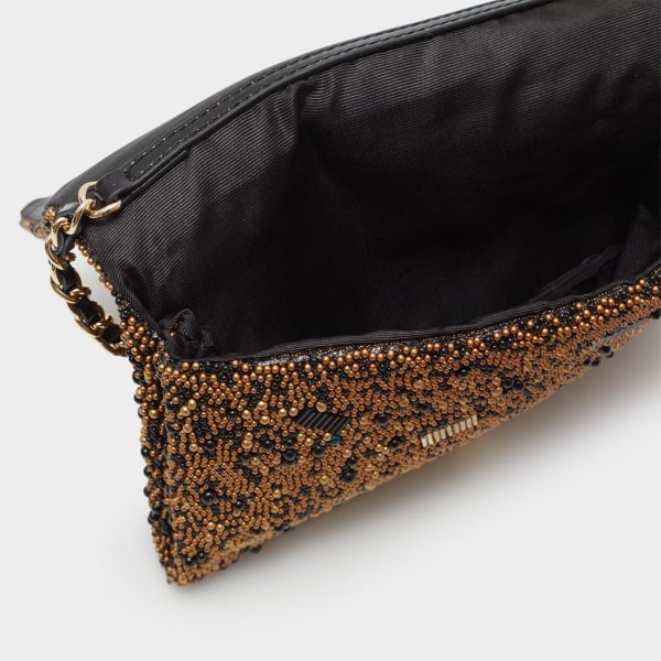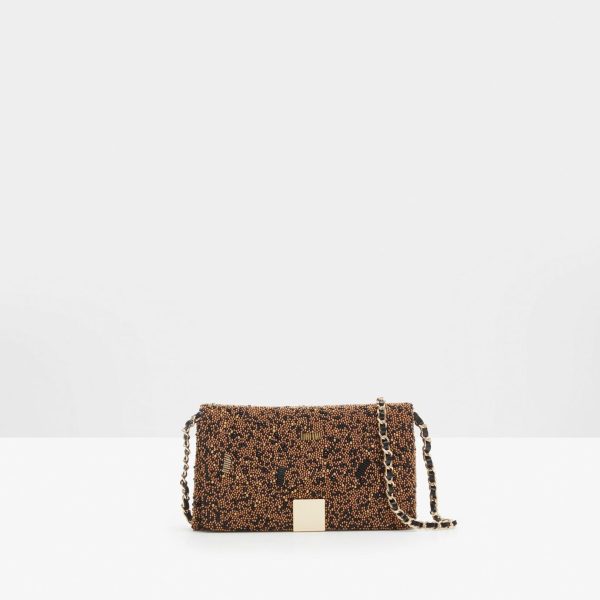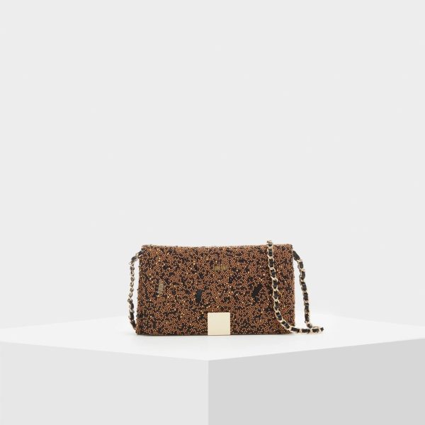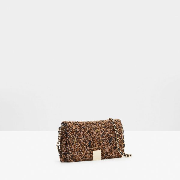 Crystal-embellished clutch with a snap fastening flap and a metallic cube plate. Chain strap and fully lined interior.