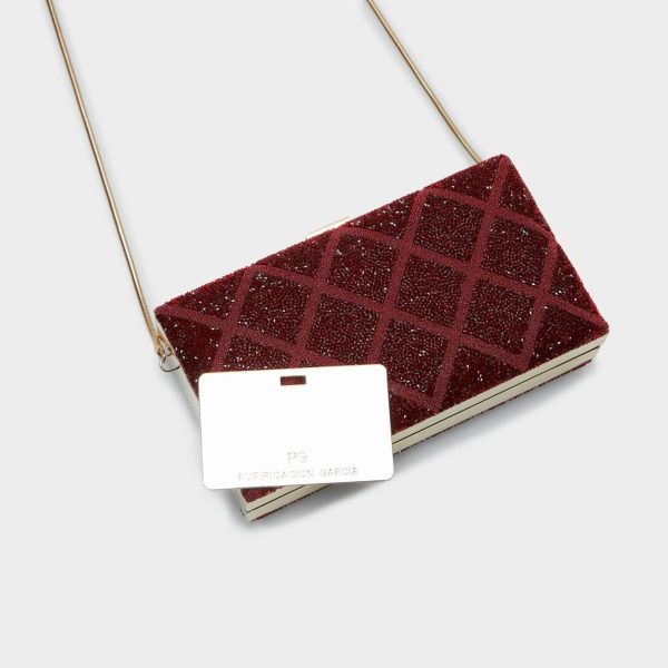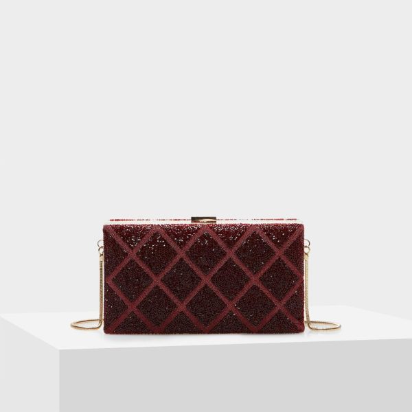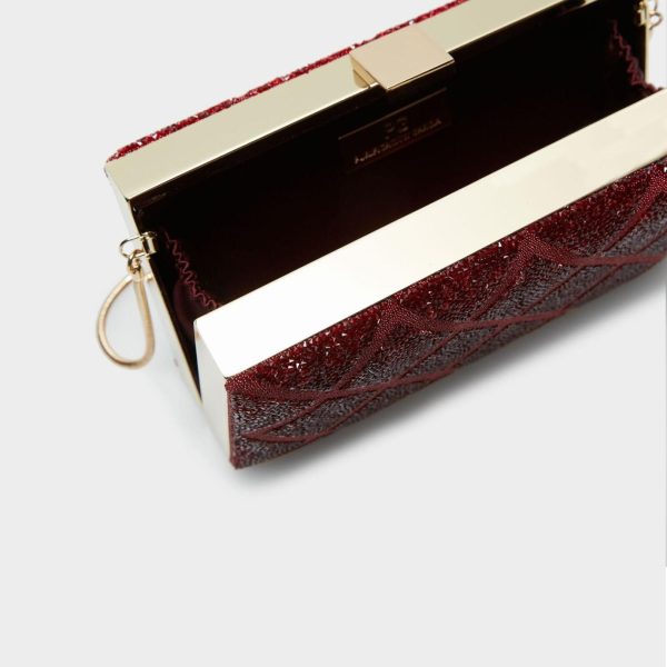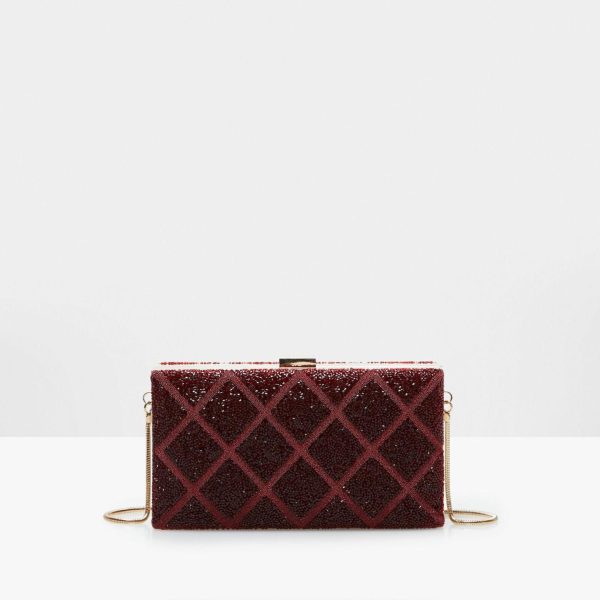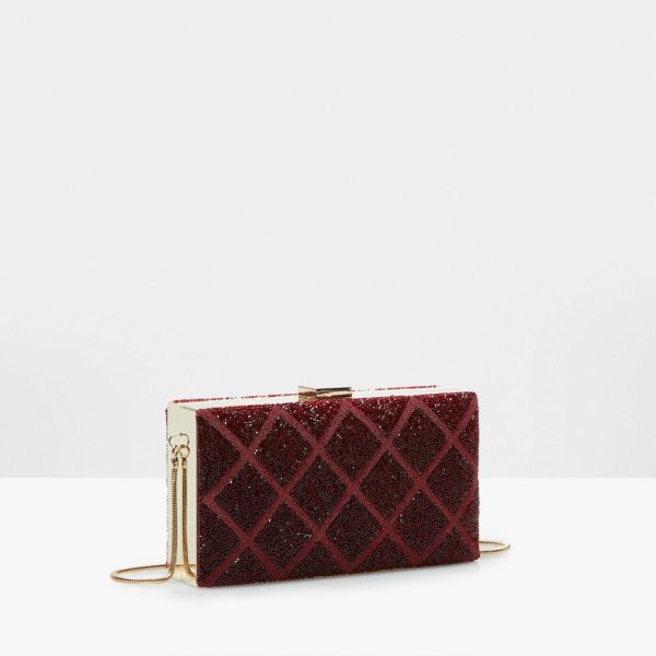 Metallic box-shaped clutch embellished with crystal beads featuring a geometric pattern. Clasp fastening and fully lined interior with a pocket mirror.