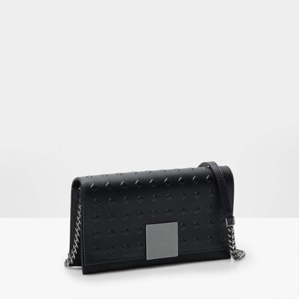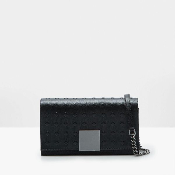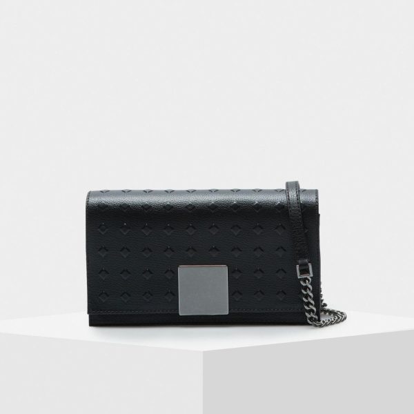 Cross body bag in leather embossed with our studs-effect Stamp. Cube-shaped clasp. Chain and leather strap and fully lined interior with a zip pocket.