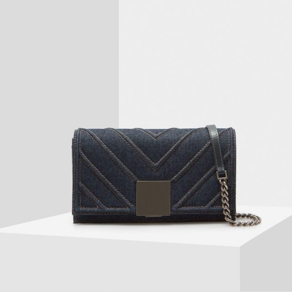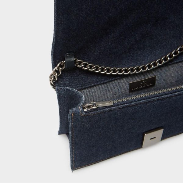 Cross body bag in denim with a geometric design and a cube-shaped clasp. Chain and leather strap and fully lined interior with a zip pocket.