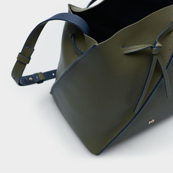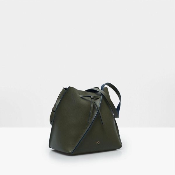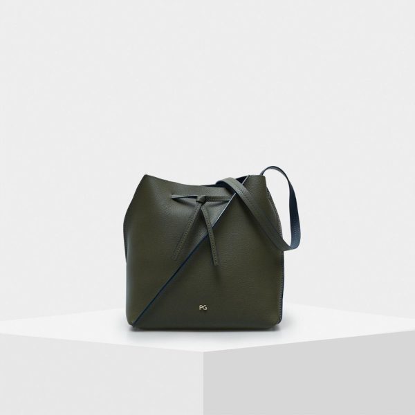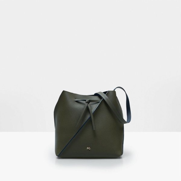 Bucket bag in double-faced leather with a geometric design and a pliable body. Drawstring top and matching adjustable strap with contrasting edging. Metallic PG logo at the front.