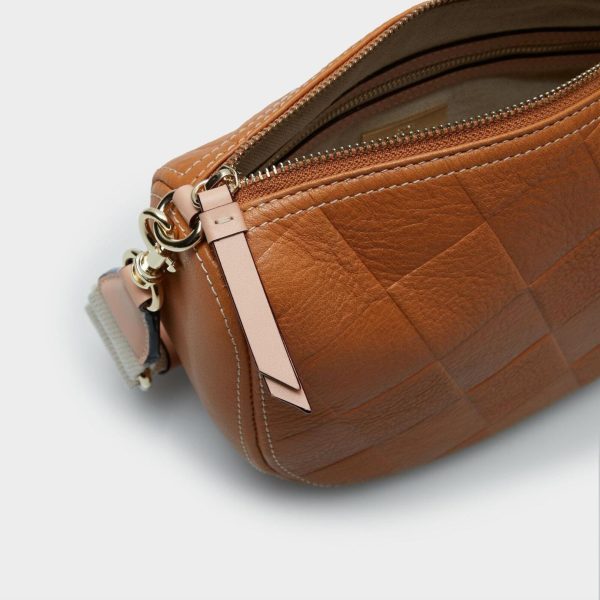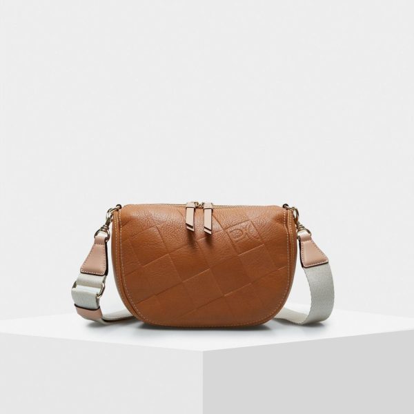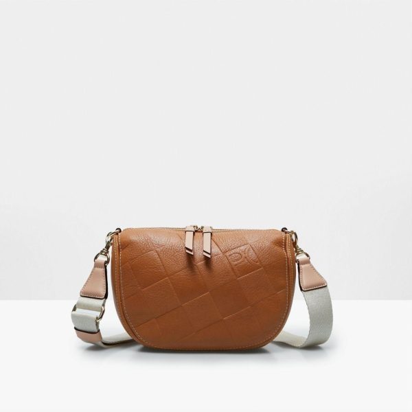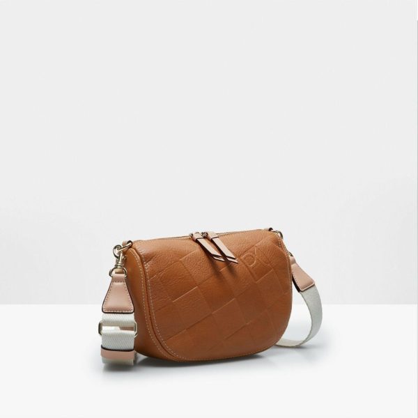 Cross body bag in leather embossed with our PG cubes Stamp. Adjustable and detachable strap in contrasting grosgrain. Zip fastening and fully lined interior with a zipper pocket.