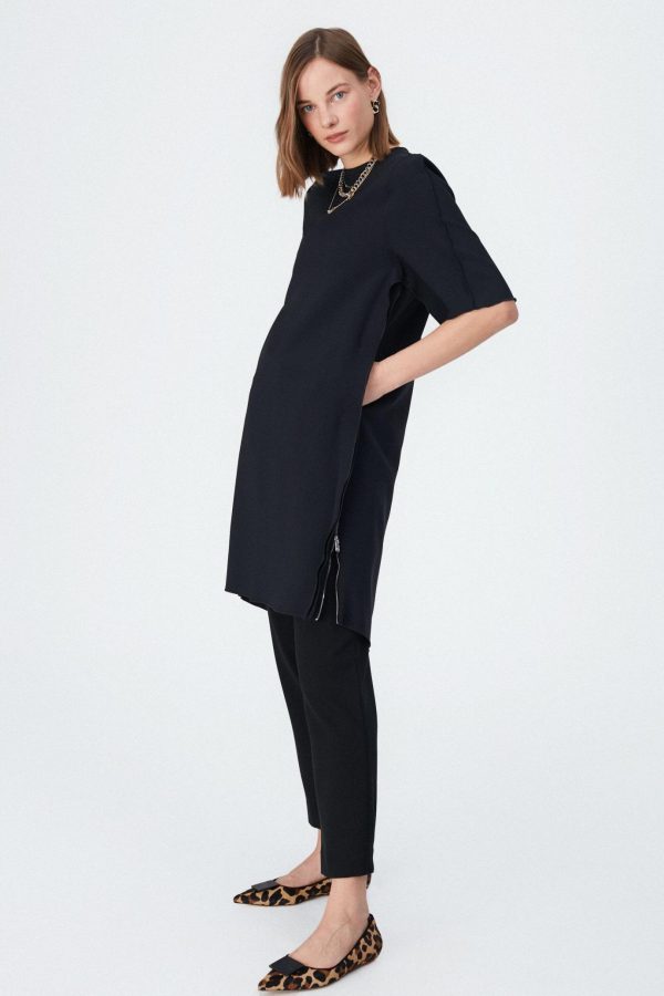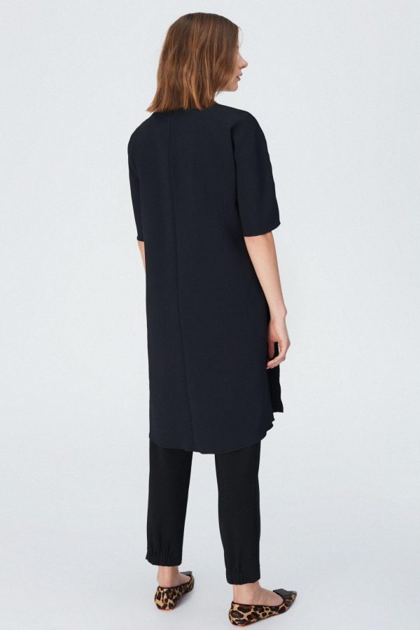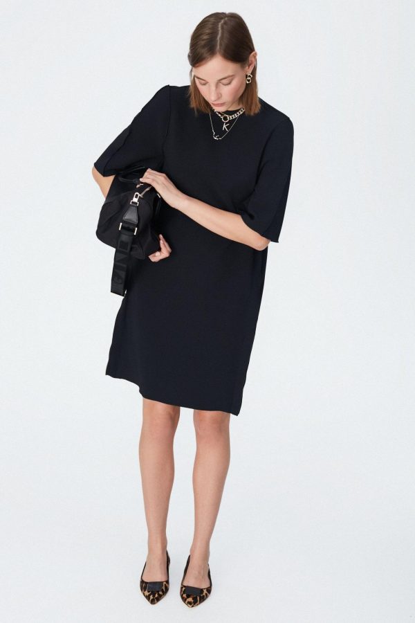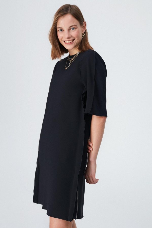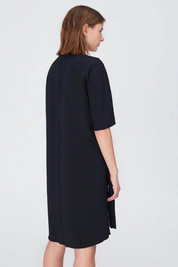 Cocoon crepé dress detailed with a side zip. Round neck, short sleeves and side pockets. Model is 176 cm | 5′ 9″ and is wearing a size Small.