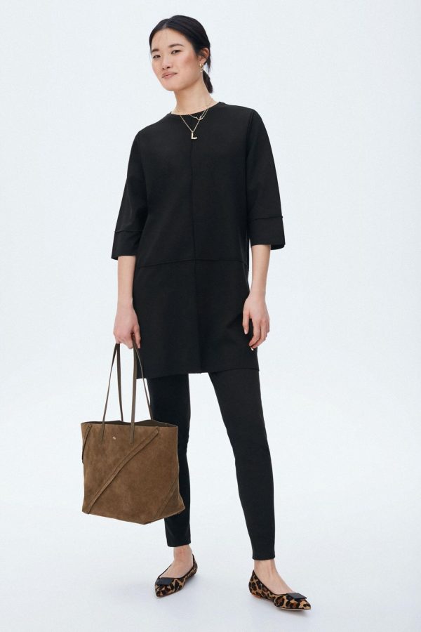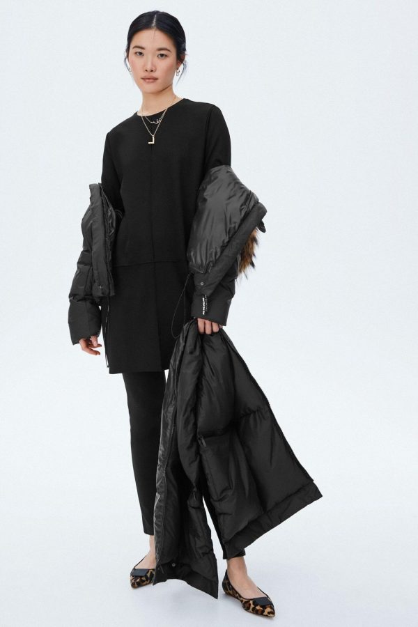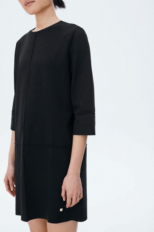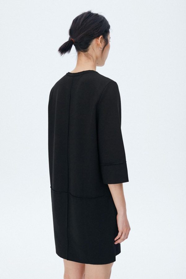 Cocoon crepé dress detailed with a side zip. Round neck and 3/4 sleeves. Model is 180 cm | 5′ 9″ and is wearing a size S.