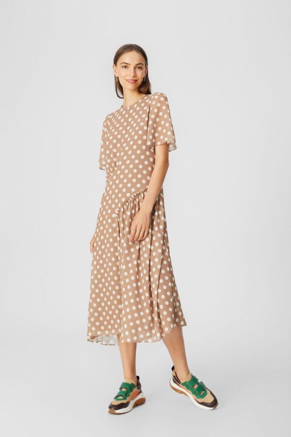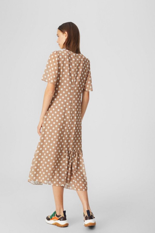 Crepe midi dress with polka dots print. Side ruffle and front frills. Crew neck and short sleeve. Model is 180 cm | 5′ 10″ and is wearing a size 38.