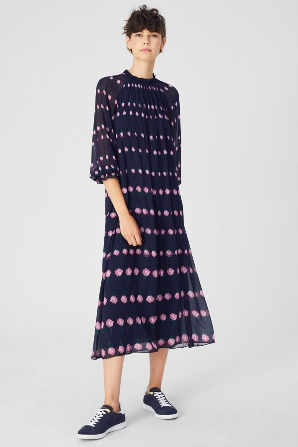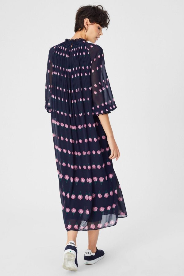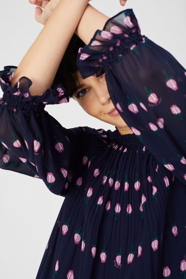 Fluid dress in pleated crepé georgette with a floral print. Round neckline and puffed 3/4 sleeves. Model is 179 cm | 5′ 10″ and is wearing a size Medium.