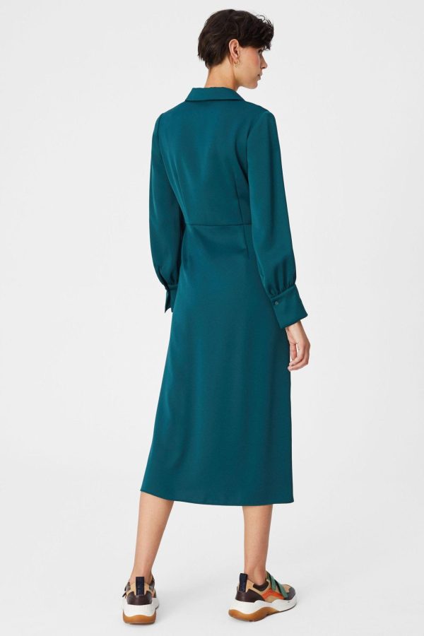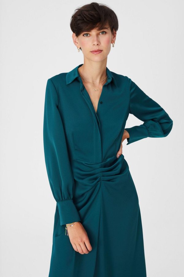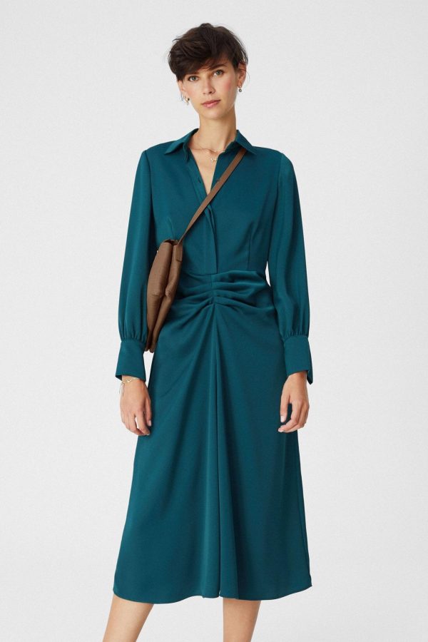 Fluid satin dress in crepe with ruffles at the waist. Shirt collar with button down and long sleeves with buttoned cuffs. Model is 179 cm | 5′ 10″ and is wearing a size 38.