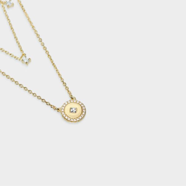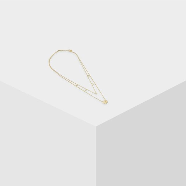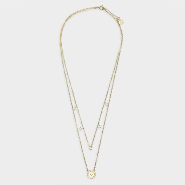 Gold-plated layered necklace. Short chain detailed with cube-shaped crystals. Long chain featuring a crystal-embellished medallion. Adjustable fastening engraved with the PG logo.