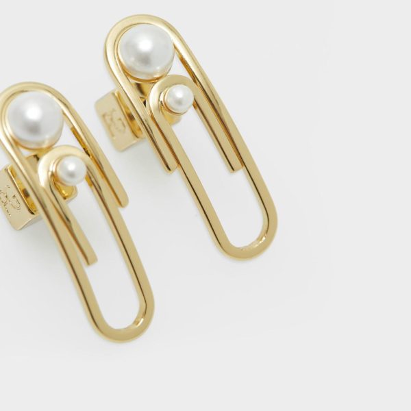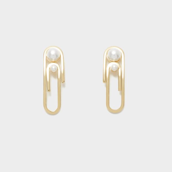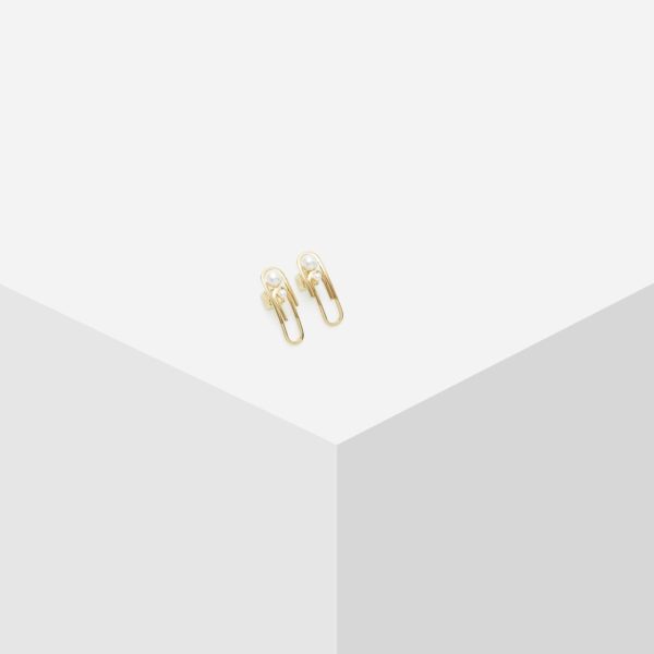 Clip-shaped gold plated earrings detailed with faux pearls. Cube-shaped fastening.