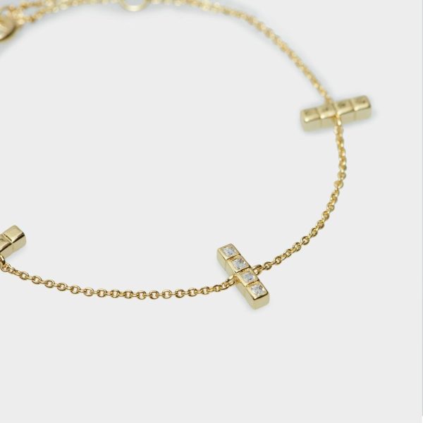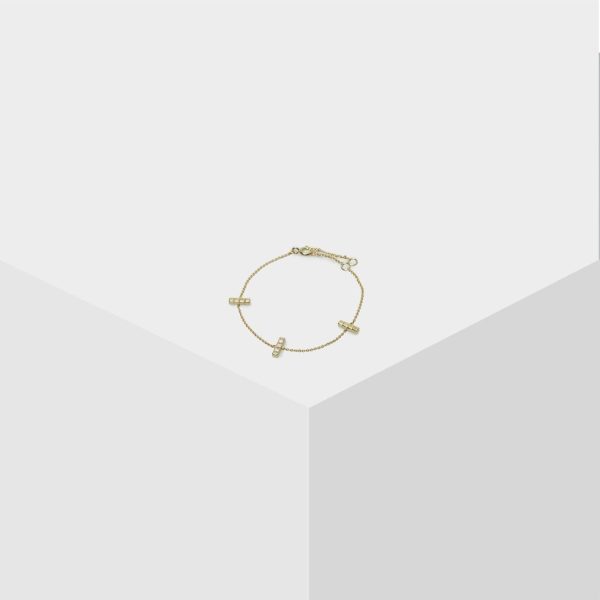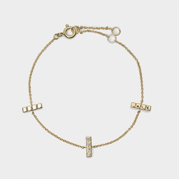 Gold plated bracelet detailed with crystal pieces in the shape of small cubes. Adjustable lobster clasp.