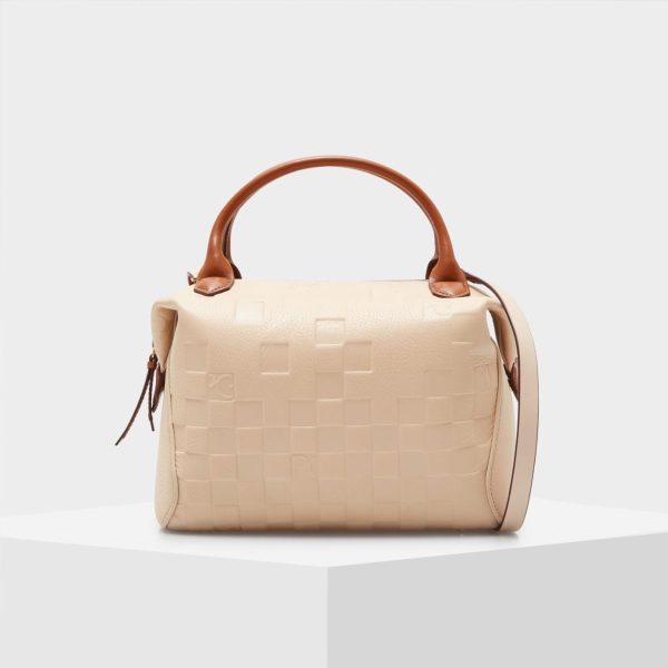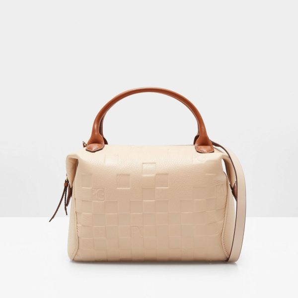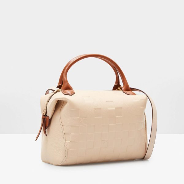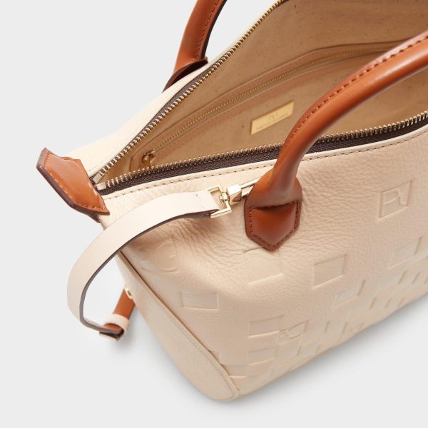 Bowling bag in white leather embossed with our PG cube pattern. Contrasting leather handles, zip fastening and fully lined interior with a zip pocket.