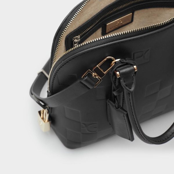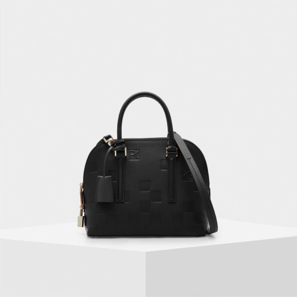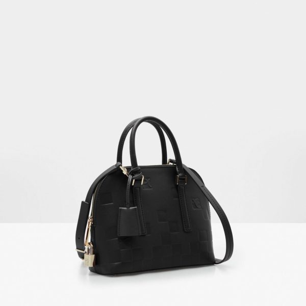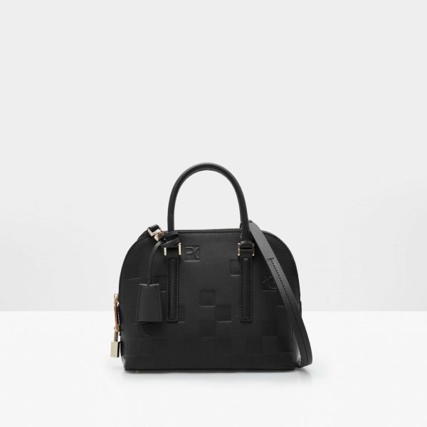 Leather bag embossed with our Domino cube pattern and detailed with a leather charm with keys. Zip fastening, matching handles and detachable and adjustable strap. Fully lined interior in cotton and linen with a zip pocket.