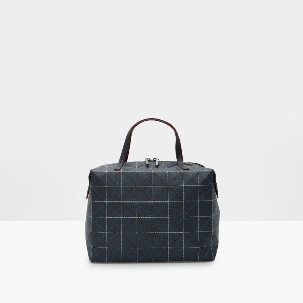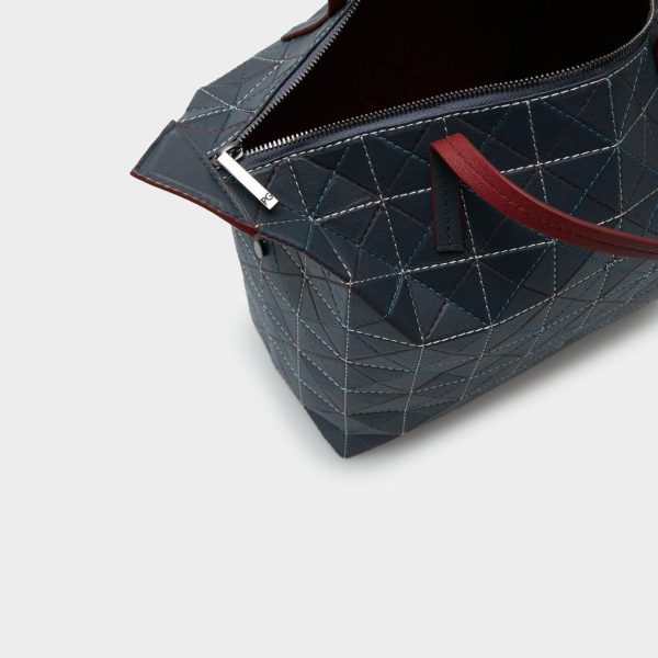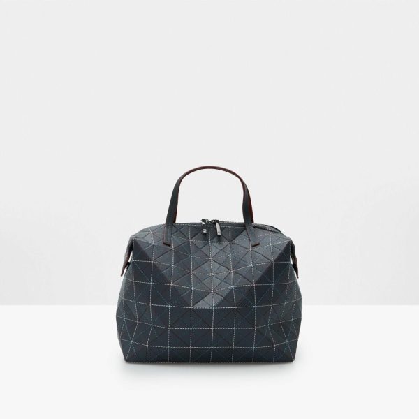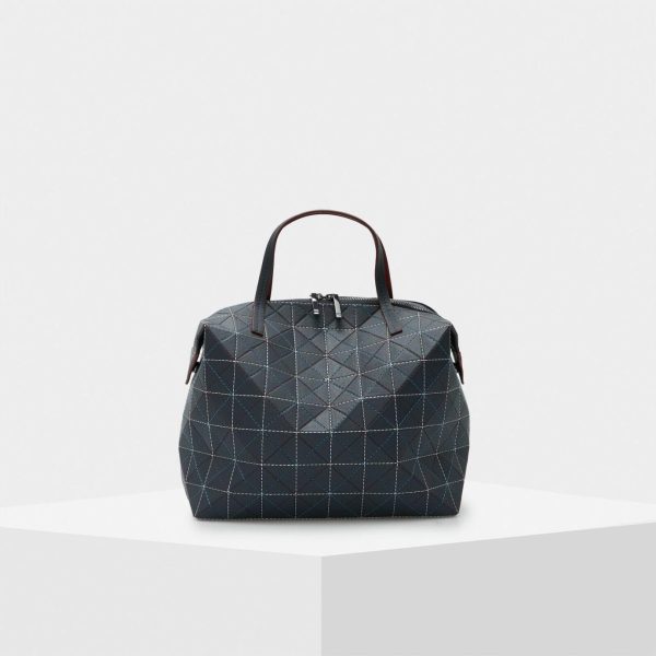 Bowling bag in leather with an origami-inspired design and contrasting stitching. Matching handles with contrasting edging. Two-way zip fastening and metallic side snaps for expansion. Fully lined interior in contrasting cotton.
