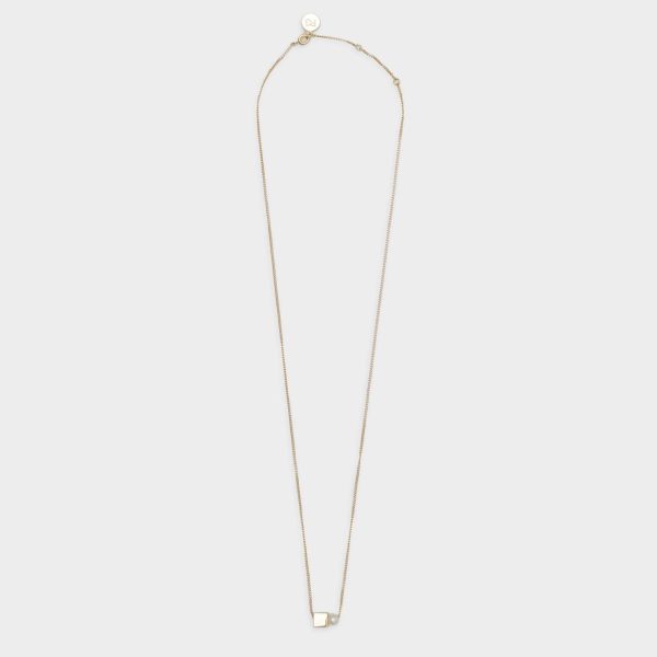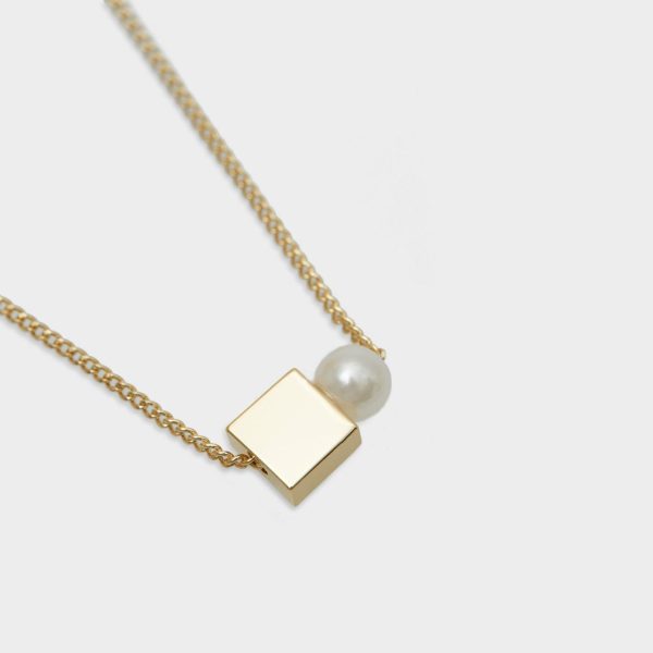 Gold plated necklace featuring a short chain and detailed with a faux peal and a cube.