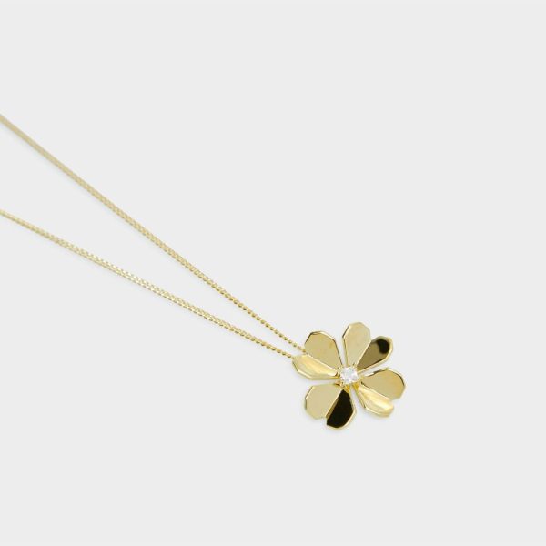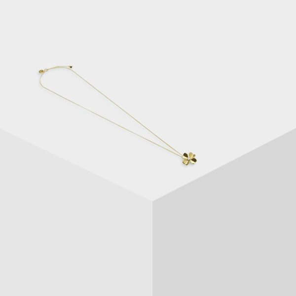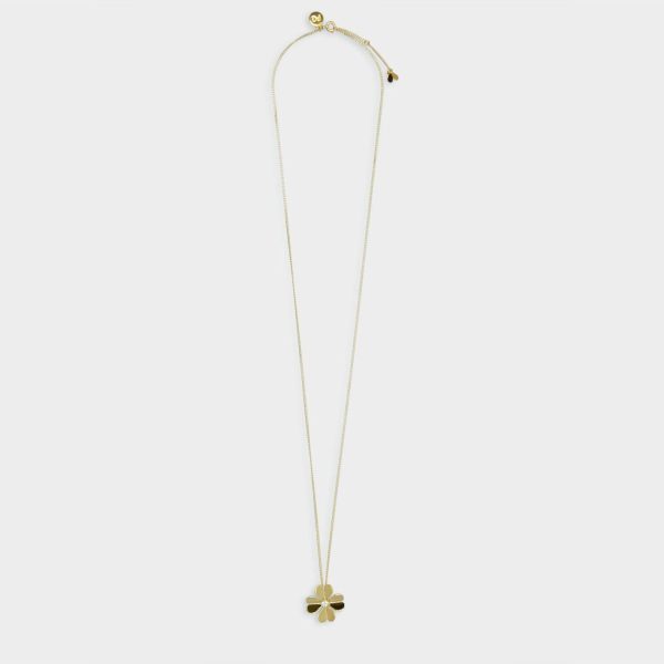 Gold plated necklace with a clover-shaped pendant featuring a thin chain and a crystal. Adjustable lobster clasp.