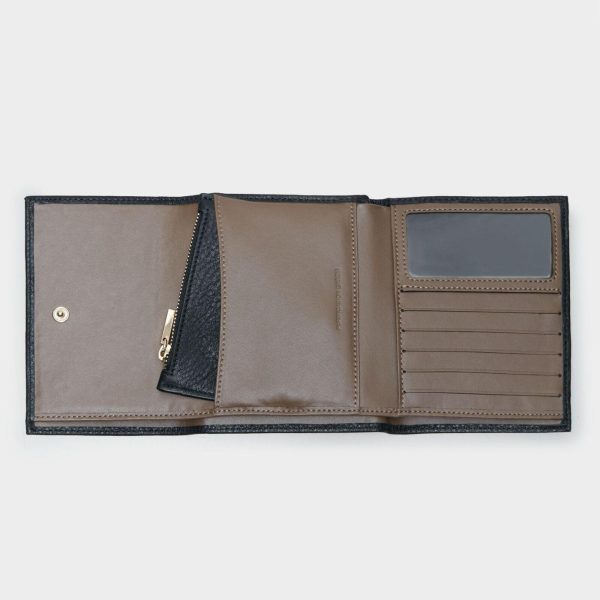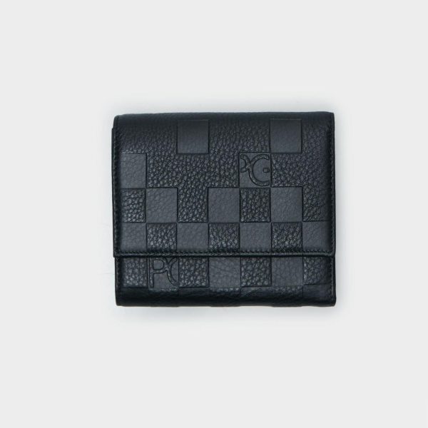 Japanese wallet in leather embossed with our PG Cubes Stamp. Snap fastening. Interior with compartments for bills, 6 card slots and a detachable zipped coin purse.