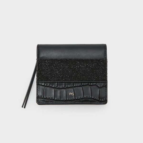 Japanese wallet in leather with a patchwork design in different textures, matching beads and the metallic PG logo. Interior compartments for bills, cards and coins.