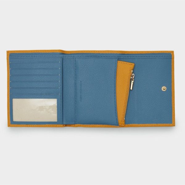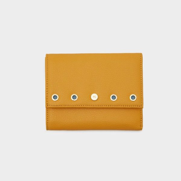 Japanese wallet in leather detailed with metallic eyelts. Snap fastening. Interior with compartments for bills, 6 card slots and a detachable zipped coin purse.