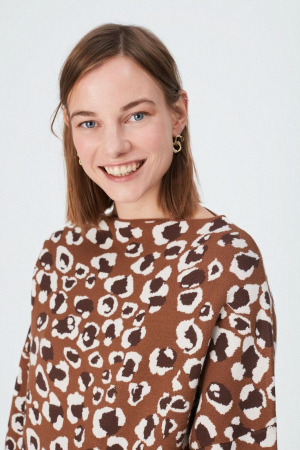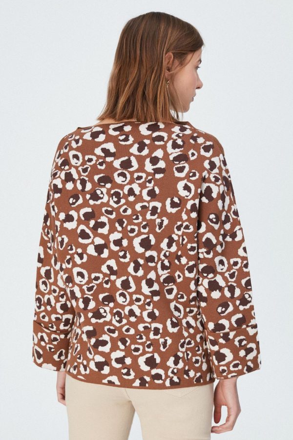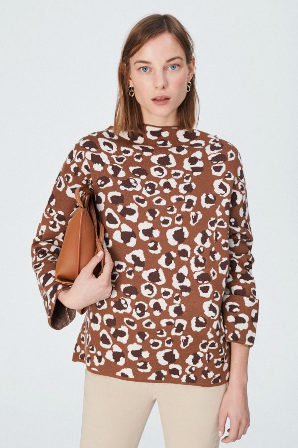Oversized sweater in animal print jacquard. Perkins neck and long sleeves. Model is 176 cm | 5′ 9″ and is wearing a size Small.