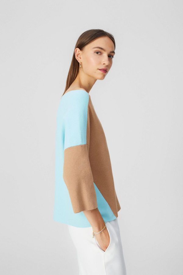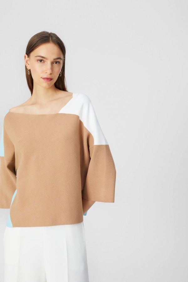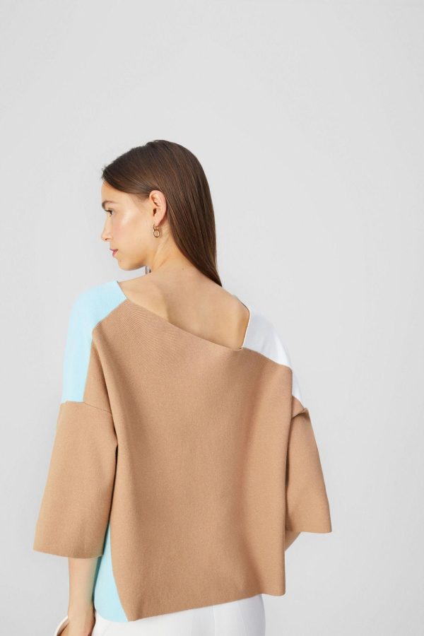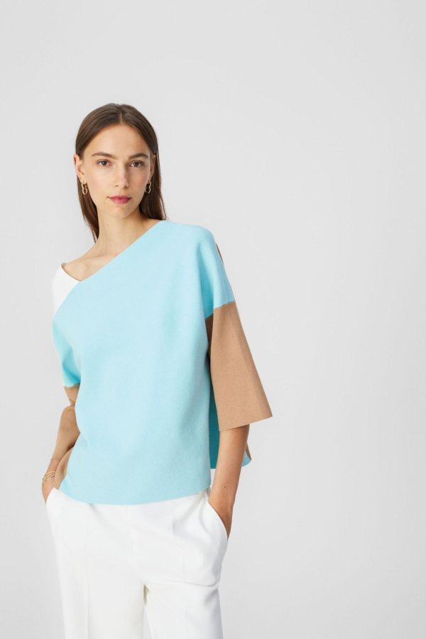 Straight fit sweater in stretch-knit with a colour-block design. Asymmetric neckline in front and back, 3/4 sleeves. Model is 180 cm | 5′ 10″ and is wearing a size Medium.