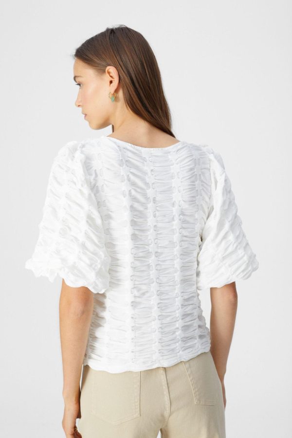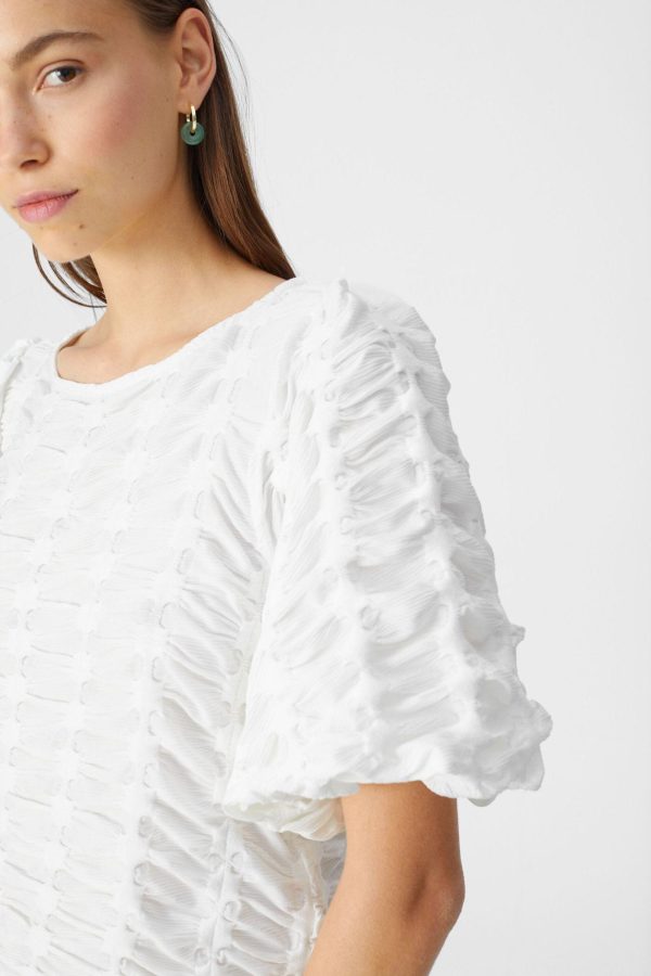 Fitted sweater in ribbed stretch-knit with puffed short sleeve and crew neckline. Model is 180 cm | 5′ 10″ and is wearing a size Medium.