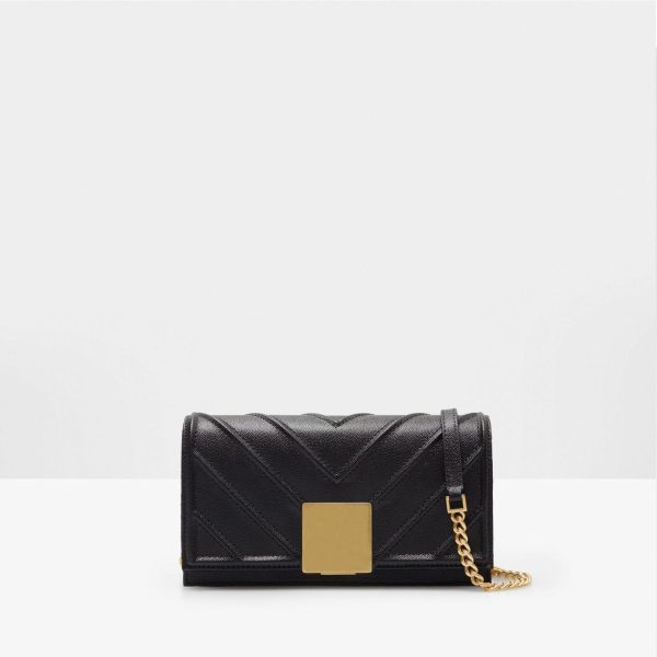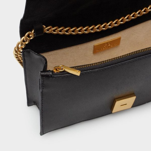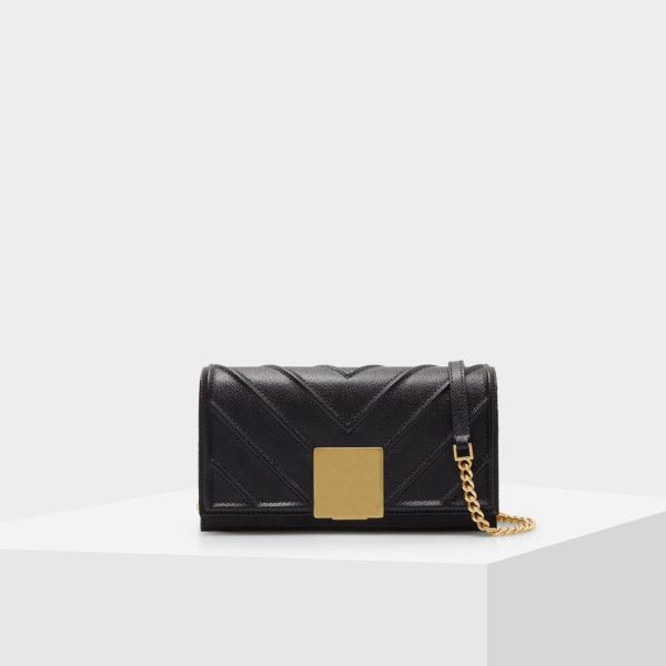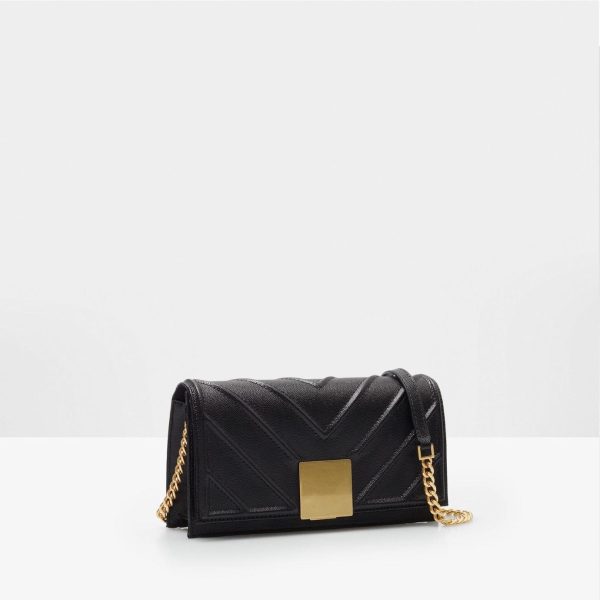 Cross body bag in Quinoa leather with a geometric design and a cube-shaped clasp. Chain and leather strap and fully lined interior with a zip pocket.