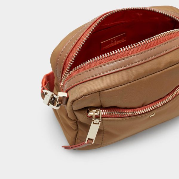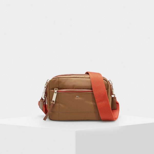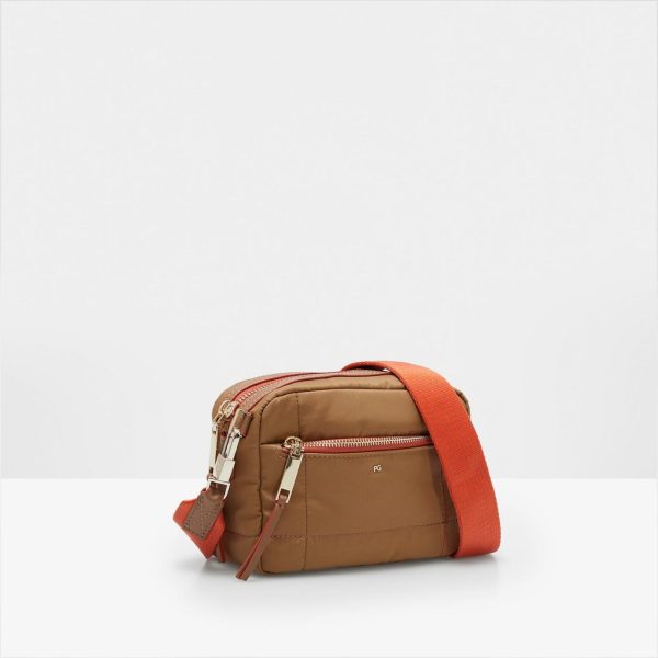 Cross body bag in quilted nylon with matching stitching. Zip fastening and detachable strap in grosgrain. Exterior zip pocket.
