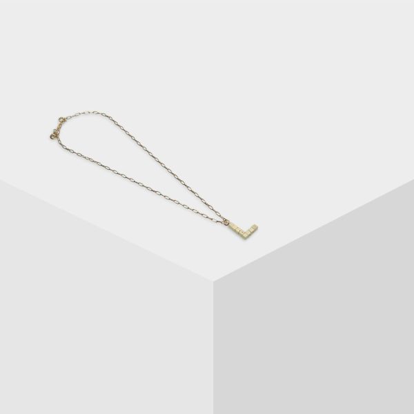 Gold plated necklace with a L-shaped pendant featuring cubes and detailed with a zircon. Adjustable lobster clasp.