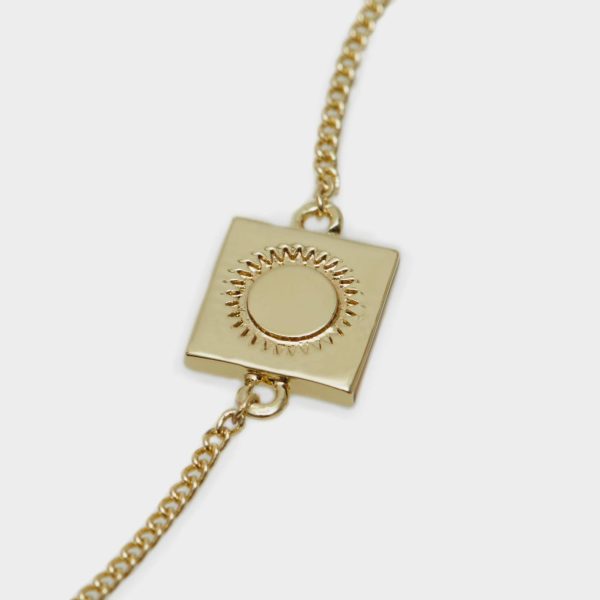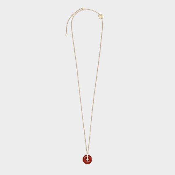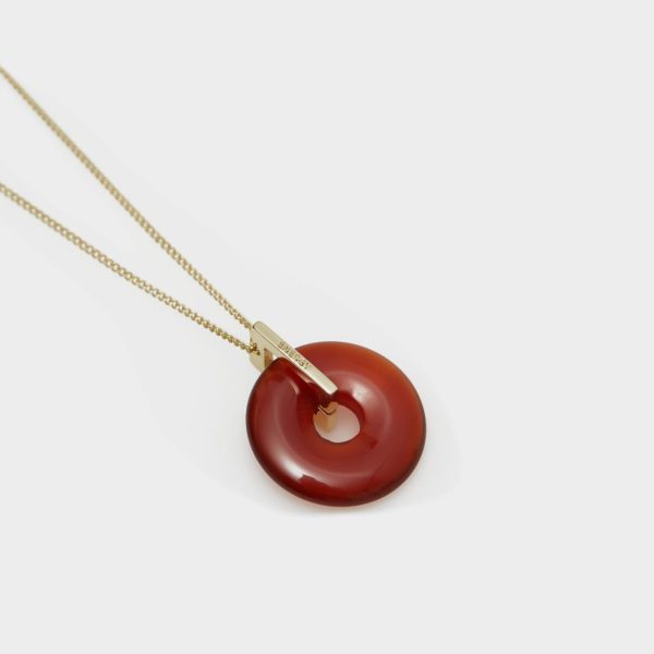 Gold plated necklace detailed with a semi-precious carnelian stone, known for increasing energy, vitality and motivation, and helping to face fears and channel emotions. Adjustable clasp and engraved cube plaque.