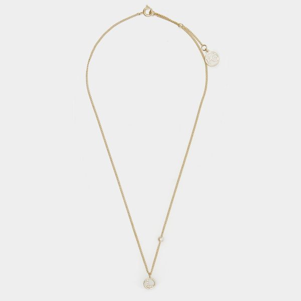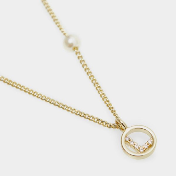 Gold plated necklace featuring a thin chain with a faux pearl and a crystal-embellished letter “L” pendant.