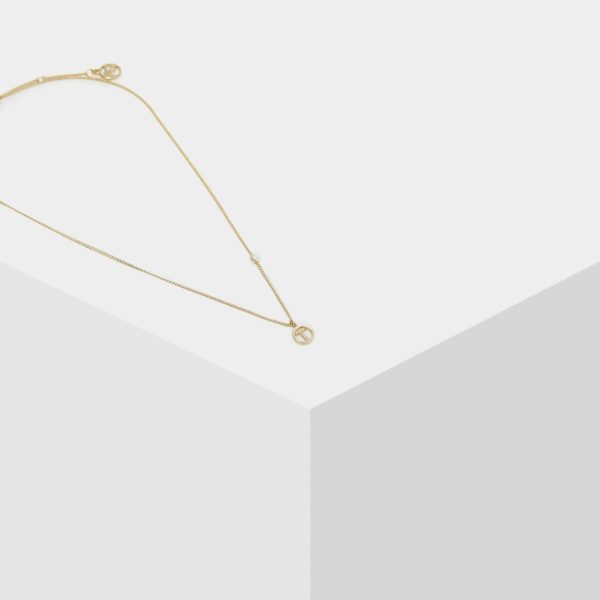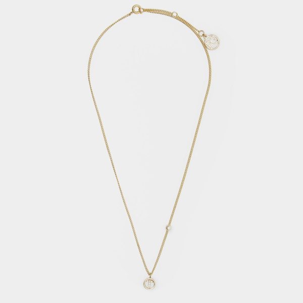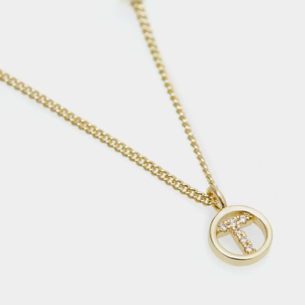 Gold plated necklace featuring a thin chain with a faux pearl and a crystal-embellished letter “T” pendant.