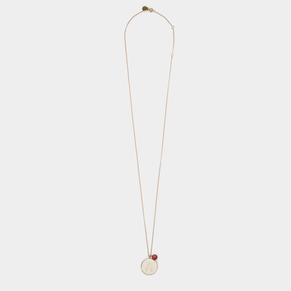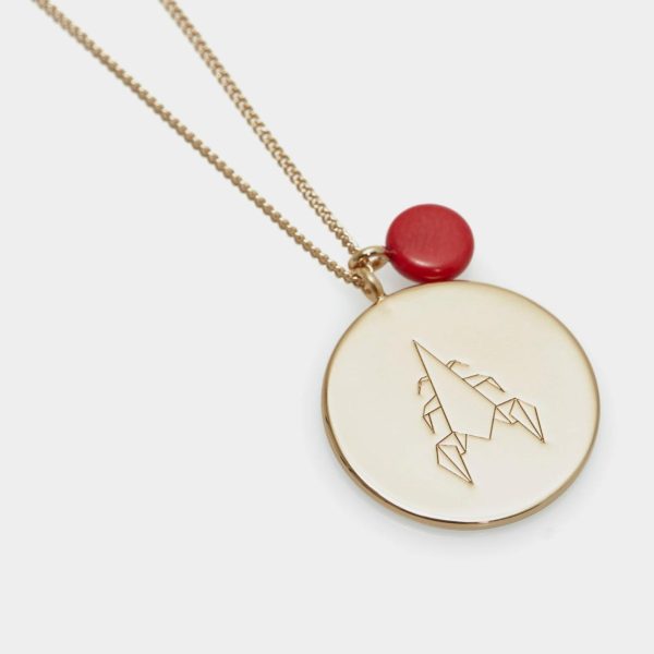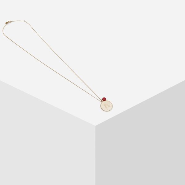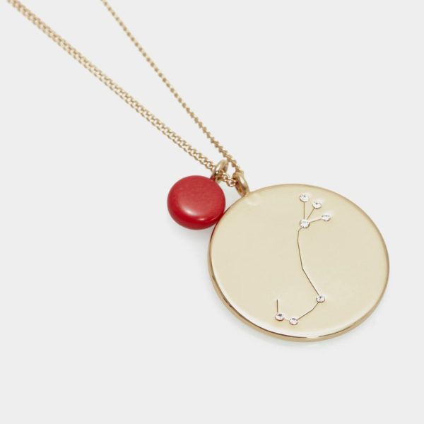 Gold plated necklace featuring a thin chain with a coral bead and an engraved pendant with the Scorpio symbol and crystal-encrusted constellation.