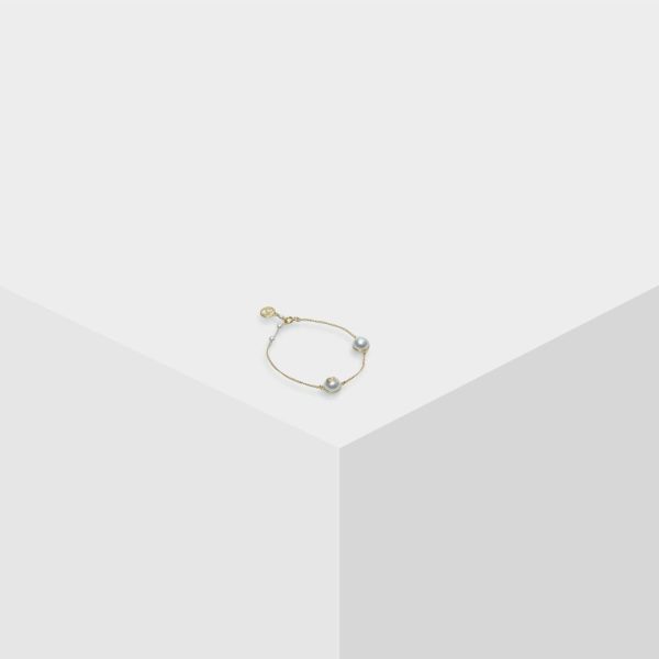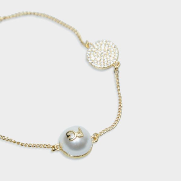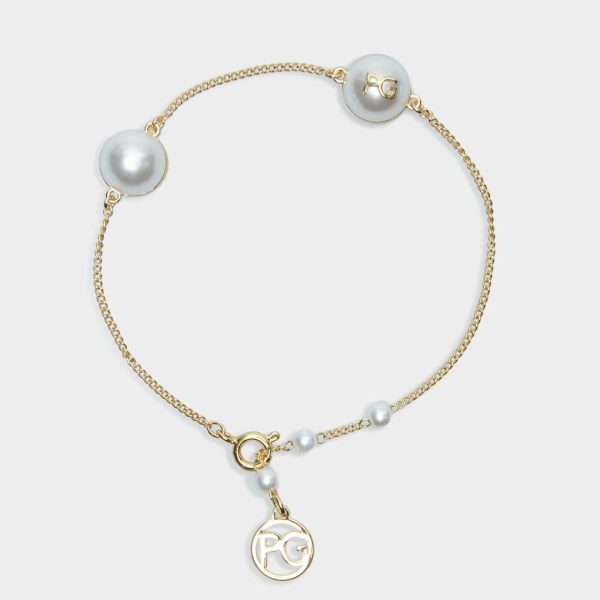 Gold plated bracelet with two half faux-pearl pendants detailed with zircons and our PG logo. Ajustable lobster clasp detailed with faux-pearls.