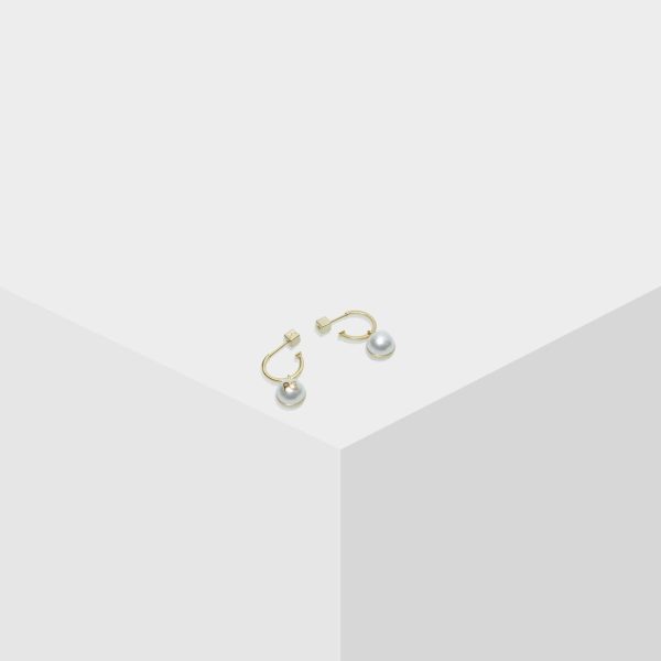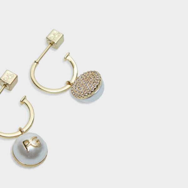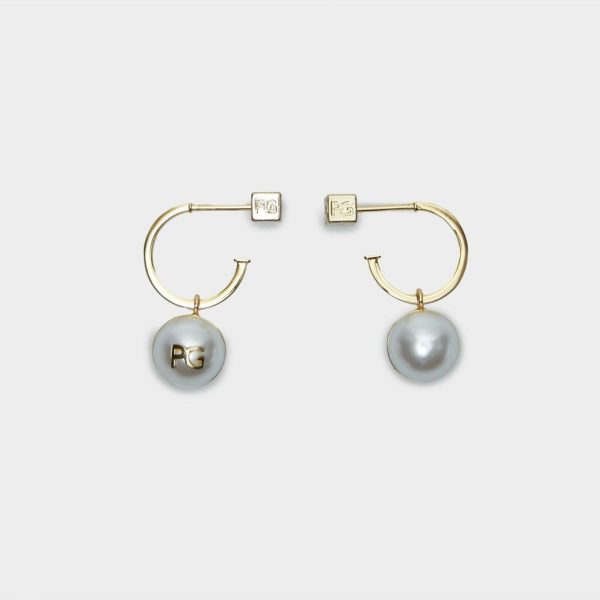 Gold plated hoop earrings with a half faux-pearl detailed with zircons and our PG logo. Cube-shaped press stud fastening.